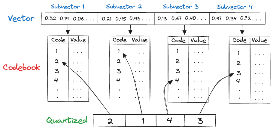 As an example, consider starting with 128-dimensional vector consisting of 32-bit floats. Quantizing it to an 8-bit integer vector with 4 dimensions as in the image above, we can significantly reduce memory requirements.